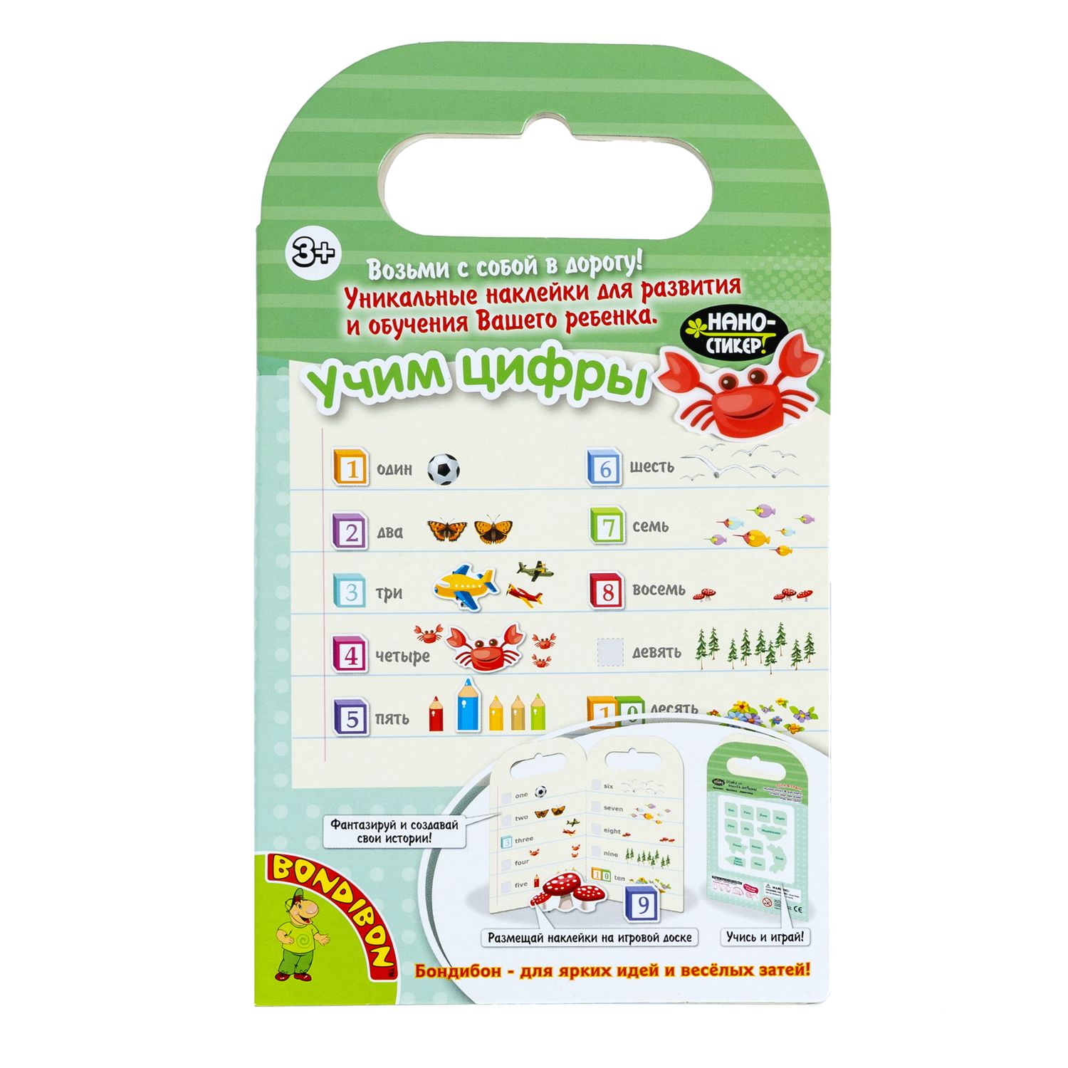 Многоразовые наклейки УЧИМ ЦИФРЫ – это компактный развивающий набор, который поможет занять ребенка дома и в путешествии. Приклеивай красочные нано-стикеры и изучай счет! Такое занятие не только развлечет ребенка, но и поможет потренироваться в счете от 1 до 10, разовьет речь, память, воображение, творческое начало, логику. Стикеры замечательно держаться на любой твердой поверхности и легко снимаются, не оставляя следов.