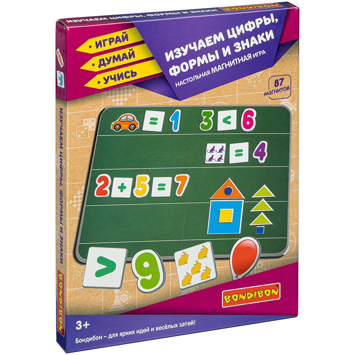 ИЗУЧАЕМ ЦИФРЫ , ФОРМЫ И ЗНАКИ серии ИГРАЙ ДУМАЙ УЧИСЬ содержит 87 красочных магнитов, которые помогут ребенку научиться считать от 1 до 9 и познакомиться с геометрическими фигурами. Совместите игровой процесс и дидактические задания. Познакомьтесь с такими формами, как круг, квадрат, треугольник, ромб и трапеция. Изучите знаки: равно, больше, меньше, плюс, минус. Кроме того, яркие магниты помогут в изучении основных цветов. Игра с набором направлена на развитие мелкой моторики, памяти, внимания, восприятия, воображения и логических способностей.